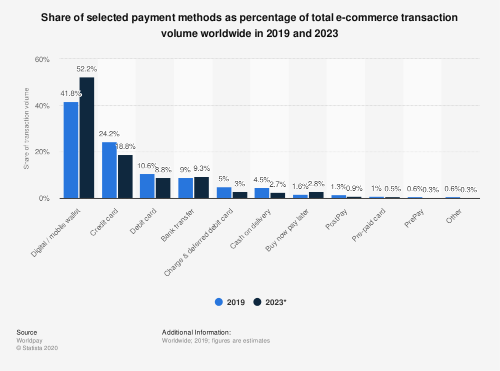 Potrivit Statista, portofelele digitale și mobile (cum ar fi PayPal sau Google Wallet) au reprezentat 42% din tranzacțiile globale de plată de comerț electronic în 2019.