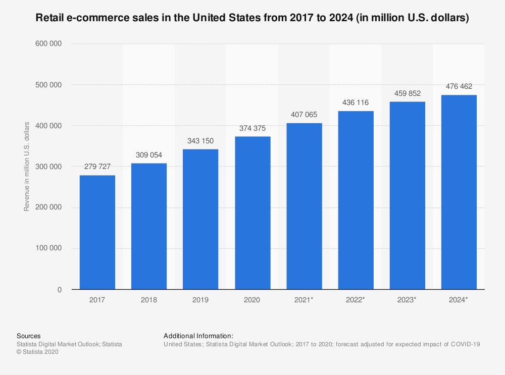 Până la sfârșitul anului 2020, cheltuielile online din SUA sunt de așteptat să atingă aproximativ 375 de miliarde de dolari.