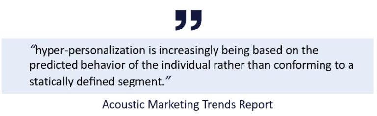 Inteligența artificială și învățarea automată nu sunt doar cuvinte la modă, ci sunt fundamentul tendinței în creștere în marketingul hiperpersonalizat. „Promisiunea marketingului unu-la-unu există de două decenii, iar mărcile încă le transmit consumatorilor o cantitate copleșitoare de mesaje de marketing irelevante, generice sau doar ușor segmentate sau personalizate”, scrie Acoustic. Instrumentele bazate pe inteligența artificială și învățarea automată analizează, procesează și furnizează automat conținut personalizat consumatorilor, lăsând mai mult timp specialiștilor de marketing pentru a se concentra pe strategie, creativitate și implementare.