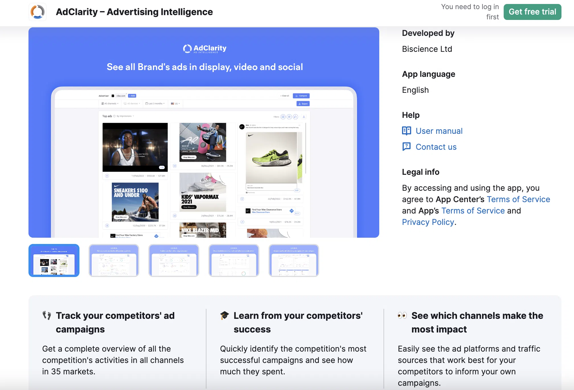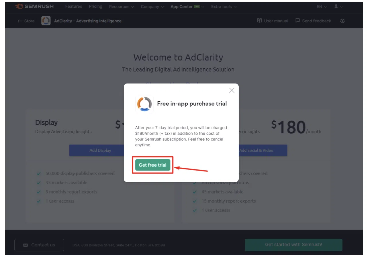 Pasul – 1: Accesați site-ul web oficial al AdClarity by Semrush Apps de aici și faceți clic pe „Obțineți o perioadă de încercare gratuită”.