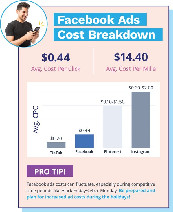 În cazul în care anunțurile de căutare plătite pe Google au tendința de a crește din cauza naturii competitive a direcționării cuvintelor cheie – CPC-ul mediu pentru Google Ads este de 2 USD-4 USD în Rețeaua de căutare, iar cuvintele cheie cele mai scumpe din Google Ads și Bing Ads costă peste 50 USD pe clic - social costurile cu reclamele media sunt mai standardizate.