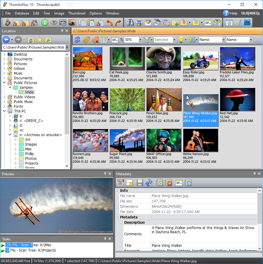 ThumbsPlus 10 este un software de gestionare a fotografiilor care vă permite să sortați imaginile și videoclipurile după asemănări și tip și să organizați folosind foldere. Puteți atribui cuvinte cheie dosarelor și, de asemenea, puteți utiliza data sau evaluările pentru a vă filtra fotografiile și a căuta prin ele. Metadatele sunt ușor accesibile pentru fiecare fotografie și le puteți edita în lot atunci când este necesar.