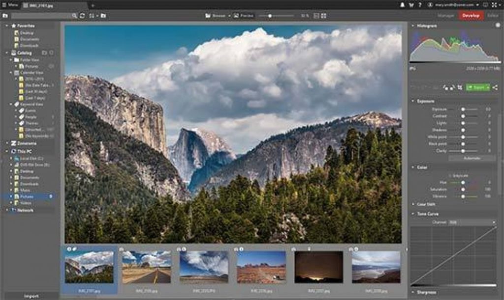 Zoner Photo Studio este un software de gestionare a fotografiilor care vine cu patru secțiuni – Manager, Dezvoltare, Editor și Creare. În secțiunea Manager, vă puteți organiza fotografiile în funcție de cuvinte cheie, titluri, date calendaristice și etichete de culoare și, de asemenea, puteți adăuga locație GPS la fotografiile dvs., astfel încât să le puteți căuta în funcție de locație și să le vizualizați pe toate pe o hartă.