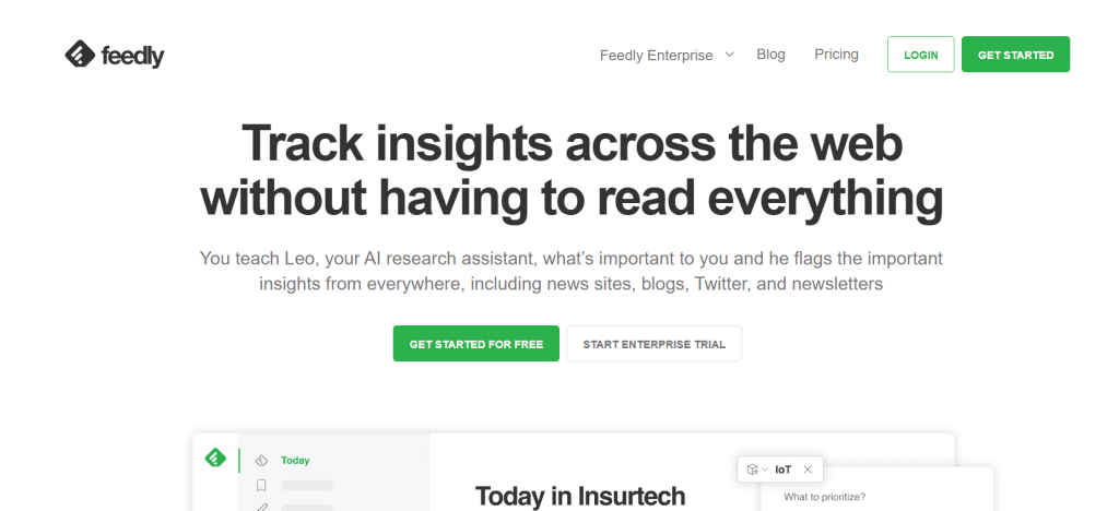 Un exemplu de instrument bazat pe RSS este Feedly. Platforma îl prezintă pe Leo, un asistent de cercetare în inteligență artificială (AI). Îl poți „învăța” pe Leo care sunt subiectele relevante pentru marca ta, iar AI-ul va organiza cel mai util conținut pentru tine. Leul nu numai că citește fiecare articol de pe lista ta, dar și prioritizează cel mai valoros cuvânt cheie, tendință, subiect și conținut.