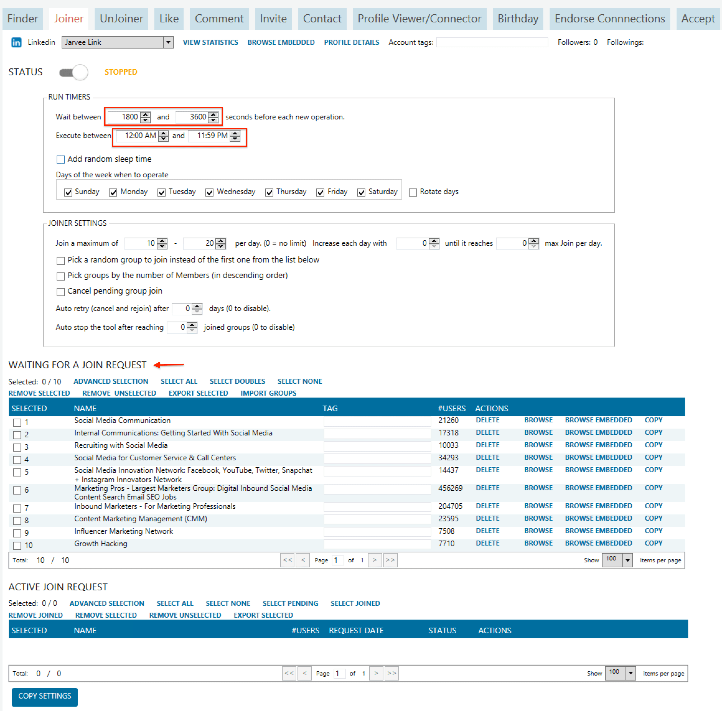 Instrumentul Joiner vă va ajuta să vă alăturați tuturor grupurilor pe care le-ați găsit cu Group Finder. Tot ce trebuie să faci este să stabilești niște întârzieri pentru a evita alăturarea prea multor grupuri într-o perioadă scurtă de timp. De obicei folosesc setările implicite pentru a fi în siguranță.