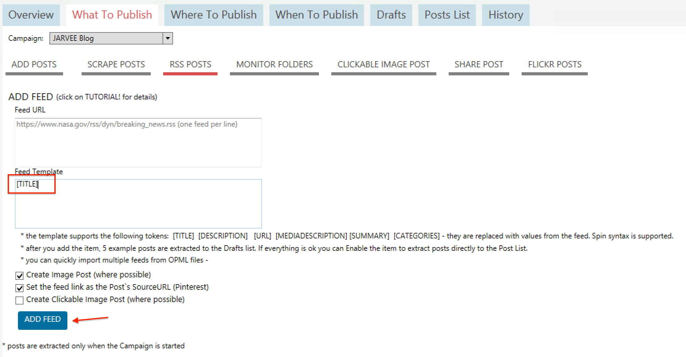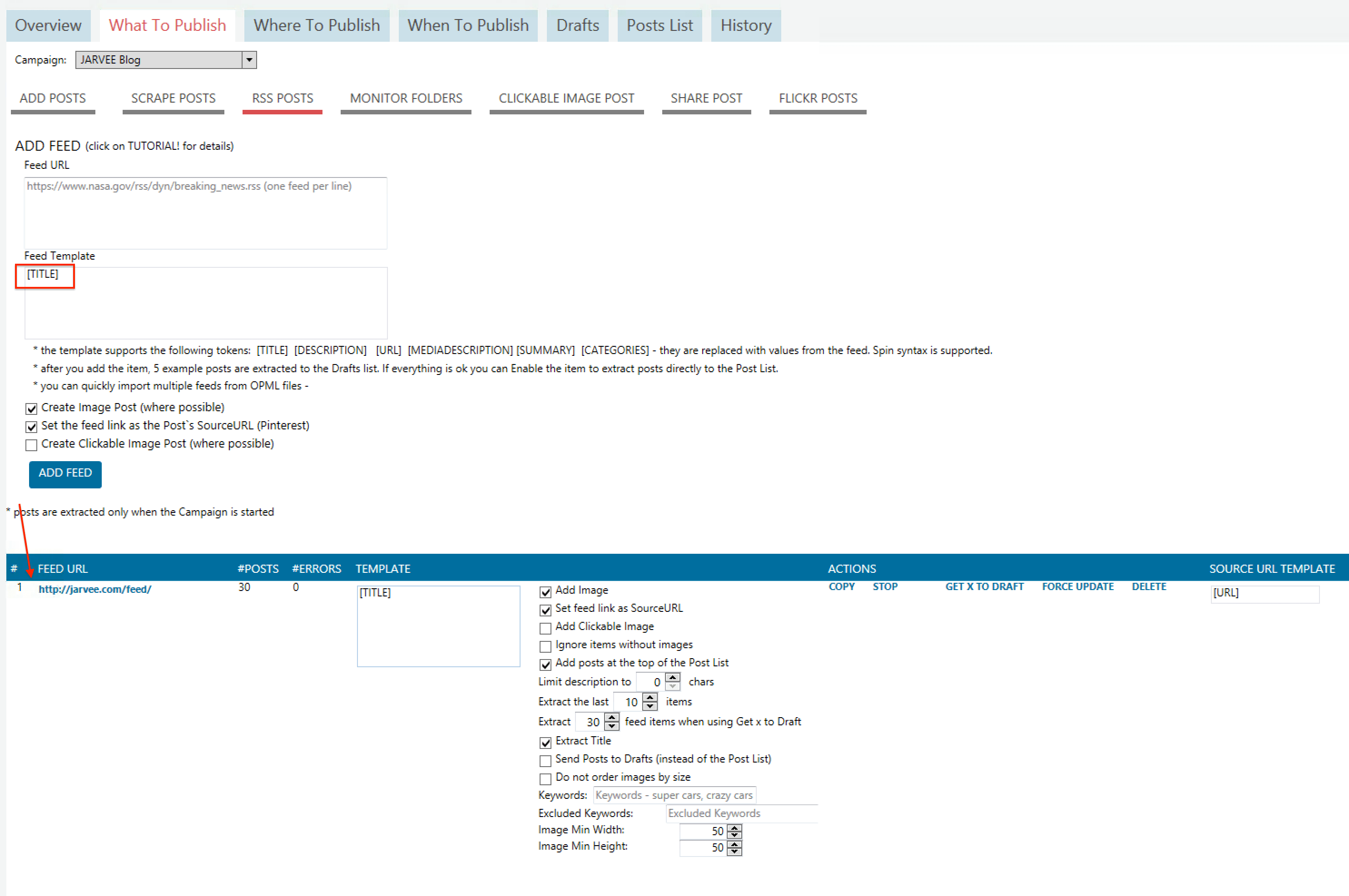 Deci, dacă planul tău este să-ți promovezi postările pe blog, cea mai bună modalitate de a adăuga acest tip de conținut pe pilot automat este să adaugi feedul RSS de pe blogul tău la campanie.Pentru a face acest lucru, accesați Ce să publicați și faceți clic pe fila POSTĂRI RSS. Adăugați adresa URL a feedului și șablonul în câmpurile corespunzătoare. Șablonul dvs. poate fi ceva de genul [TITLE] , fără alte indicative, deoarece vom seta adresa URL a postării de blog să fie URL-ul sursă a pinului.