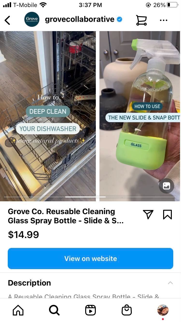Grove Collaborative utilizează Instagram Shop pentru a oferi clienților o experiență unică de navigare și posibilitatea de a verifica în aplicație. Alături de fotografii, acestea includ videoclipuri tutoriale pentru a ilustra modul de utilizare a produselor lor. De asemenea, utilizatorii pot trimite un mesaj direct către Grove Collaborative dacă au o întrebare.