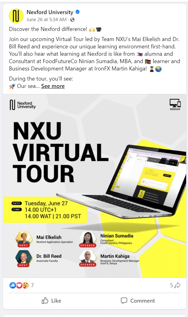 De exemplu, postările pe rețelele sociale care promovau tururile virtuale ale Nexford, cum ar fi cel văzut mai jos, au fost la un moment dat complet abandonate, din cauza unei părți interesate care nu i-a plăcut conținutul.