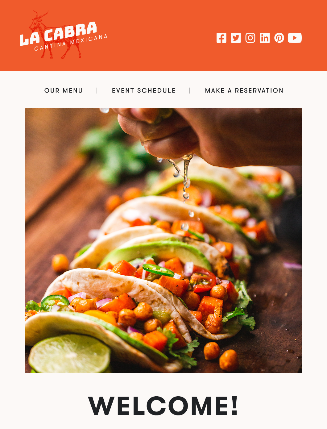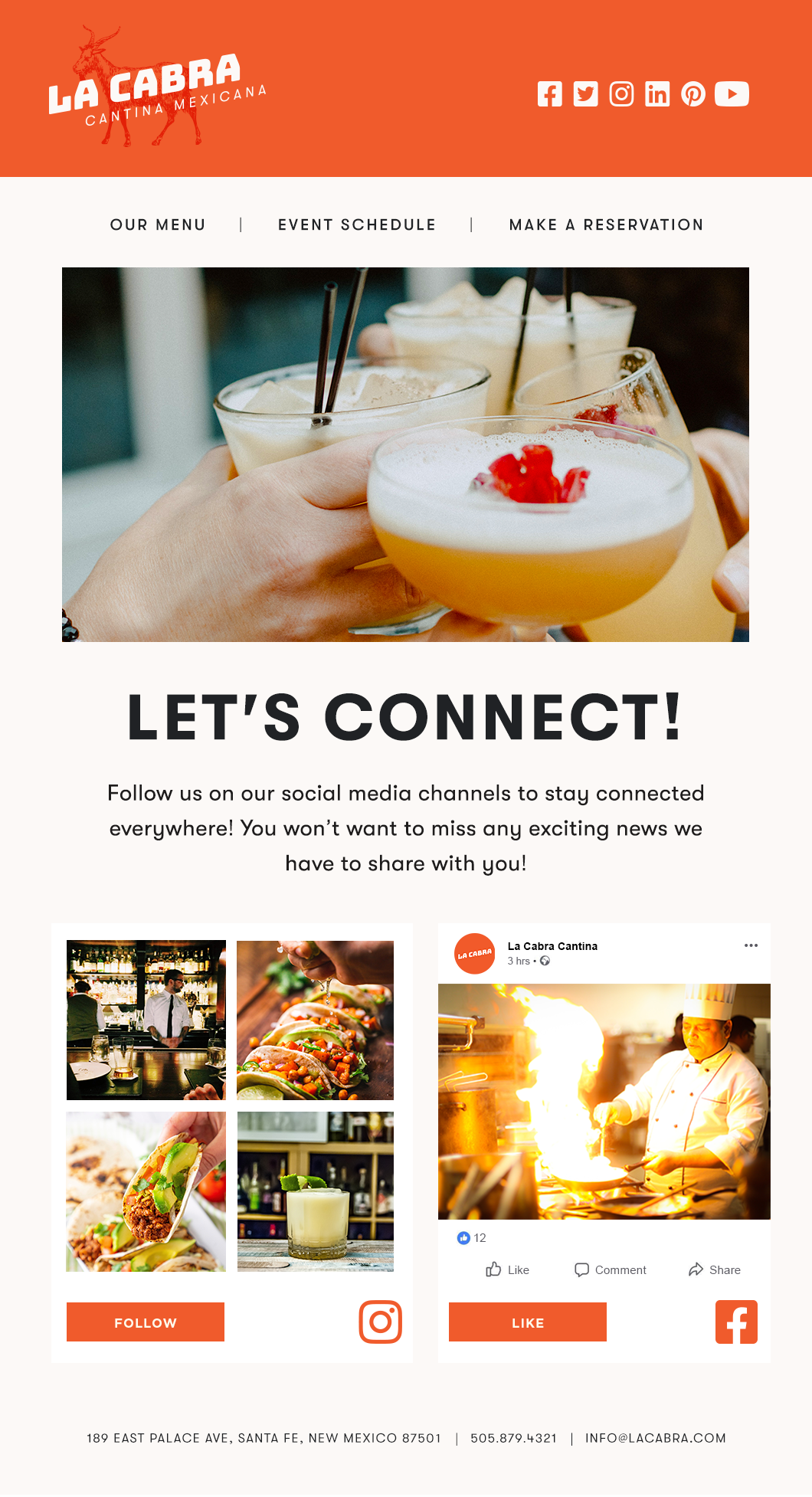Dacă eziți să ceri ceva de la abonații tăi, nu fi. În primul rând, nu le ceri să facă nimic. Ei doresc deja să interacționeze cu dvs. sau nu s-ar fi înscris pentru a vă primi marketingul prin e-mail. Așadar, invită-i să se conecteze cu tine în alte moduri; pe canalele tale de socializare, pe site-ul web al restaurantului și pe site-urile de recenzii.