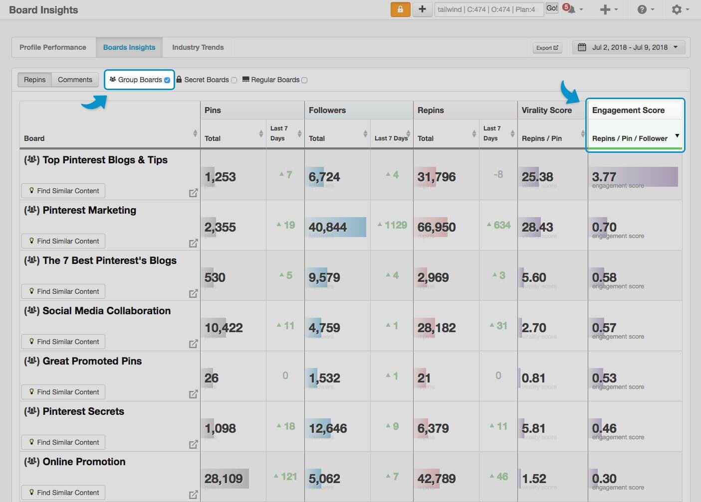 Analizați performanța panourilor dvs. de grup Pinterest cu Tailwind’s Board Insights.Ce ați făcut în BoardBooster : automatizarea atașării pe panouri de grup fără monitorizare, care sunt de fapt valoroase.