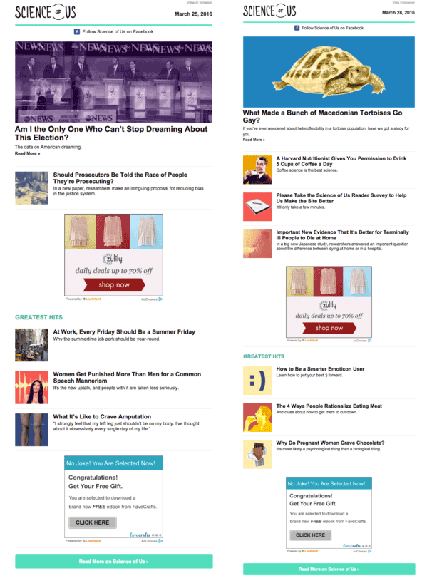 Când trimiteți întotdeauna aproximativ aceeași cantitate de conținut, se elimină îngrijorarea că un e-mail ar putea deveni prea mare și poate fi tăiat. Și nu toate buletinele informative de resumare trebuie să fie de lungă durată. O bună practică este să prezentați un titlu , urmat de un conținut secundar, fără a oferi o listă lungă și extinsă a tuturor poveștilor de pe site-ul dvs. Buletinul informativ Science of Us al NY Mag face exact asta. Iată două exemple recente: