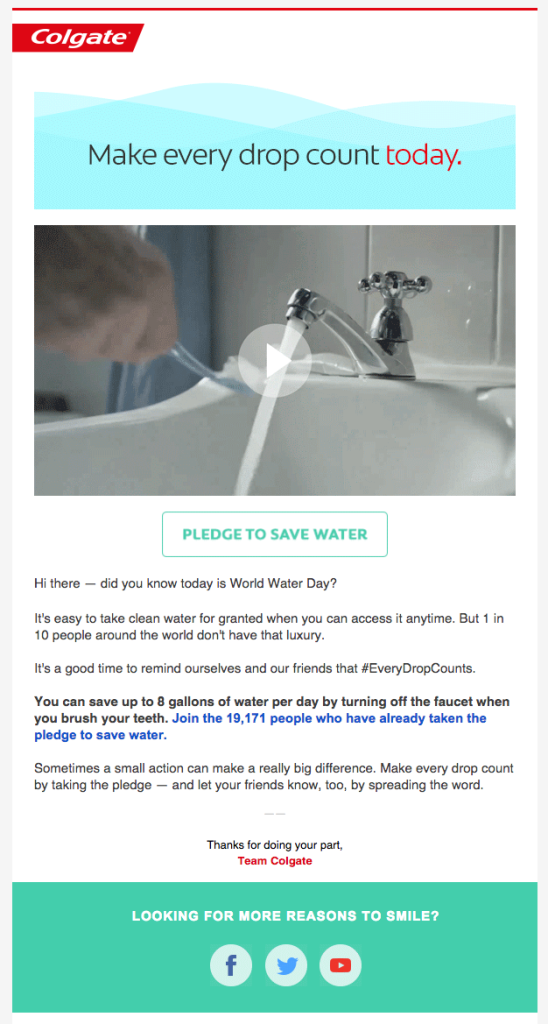 Când rămâneți la un singur mesaj din e-mailul dvs. – unul care este întărit de linia de subiect, imagini, conținut și CTA – este mai probabil să vă încadrați. Iată un exemplu grozav de la Colgate (linia de subiect: Cum să economisiți 8 galoane de apă pe zi ):