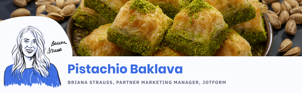 „Acest desert clasic al Orientului Mijlociu și al Mediteranei are multe variații în funcție de țara de origine. Dar ceea ce este întotdeauna consistent este aluatul crocant stratificat cu nuci și acoperit cu un sirop de zahăr delicios de dulce care va fi cu siguranță vedeta strălucitoare a mesei tale de sărbători.”