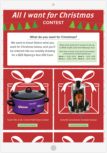Sărbătorile înseamnă dăruire, așa că oferă clienților tăi șansa de a obține ceva pentru ei înșiși. Cu o campanie All I Want de Crăciun , utilizatorii își pot împărtăși adresa de e-mail și apoi pot obține o reducere la un cadou pe care speră cu adevărat să îl primească. După o săptămână sau două de acceptare a înscrierilor, extrageți un câștigător dintre persoanele care s-au înscris pentru reducere. Asigurați-vă că alegeți un câștigător cât timp cuponul dvs. este încă valabil, astfel încât cei care nu au câștigat au încă suficient timp să iasă și să cumpere articolul.