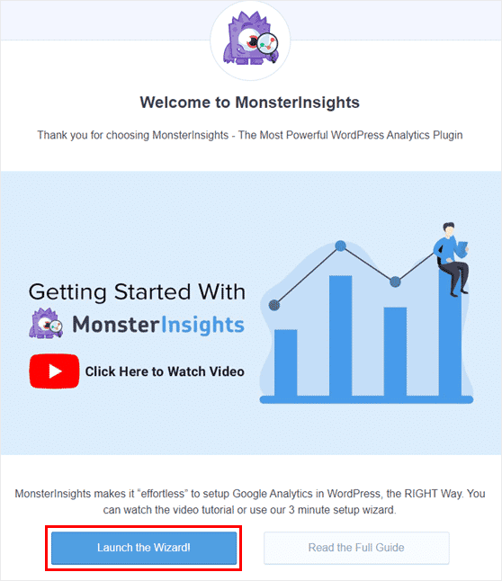 Bună treabă, MonsterInsights este instalat și activat! Finalizați configurarea contului completând Expertul de configurare , care se lansează când activați pluginul.