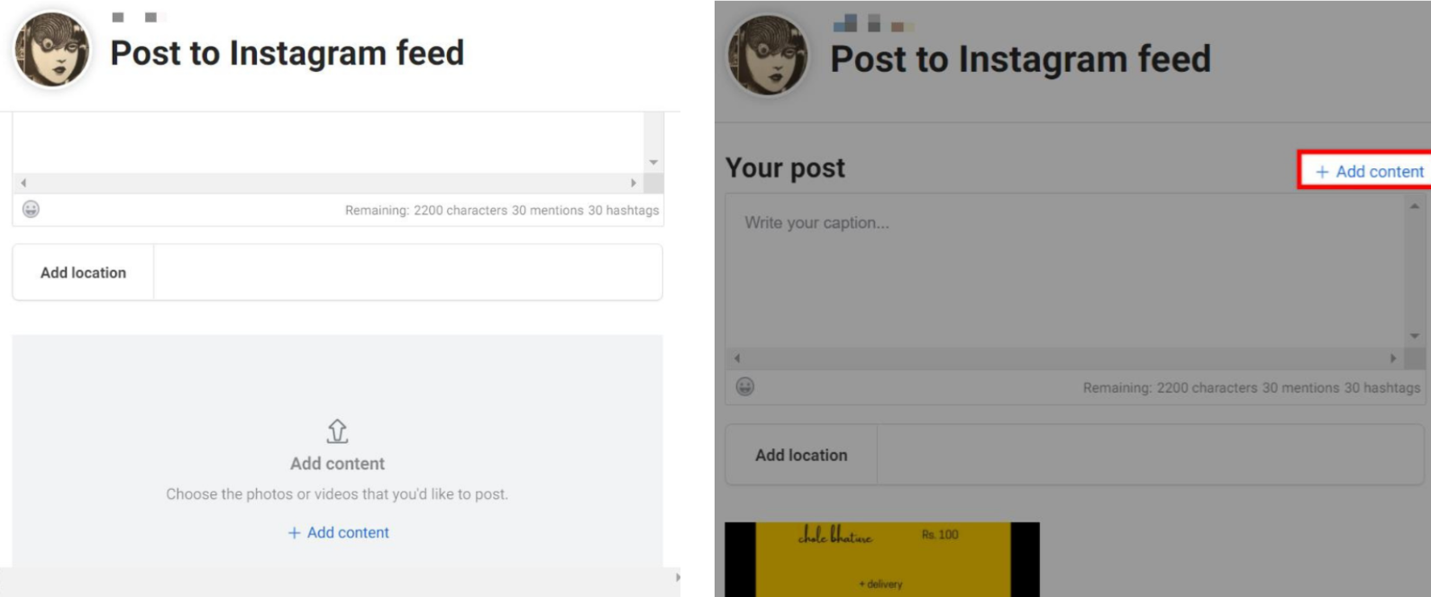 Pasul 3. Faceți clic pe butonul „Adăugați conținut” de sub fereastra de subtitrare și alegeți prima imagine sau videoclip pe care doriți să îl încărcați. După selectarea primului conținut, butonul „Adăugați conținut” se va muta în partea de sus a ferestrei de subtitrare. Faceți clic pe acest buton pentru a continua să adăugați toate fotografiile și/sau videoclipurile pe care doriți să le includeți în postare.