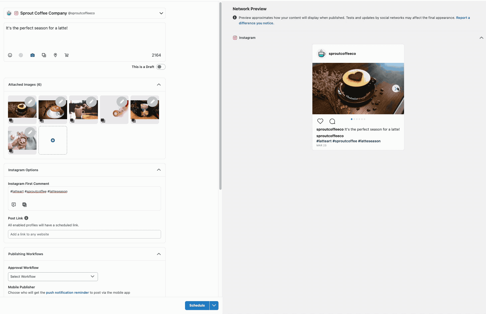 Dacă utilizați un instrument de gestionare a rețelelor sociale all-in-one, cum ar fi Sprout Social, puteți publica și programa direct postări din carusel Instagram în conturile dvs. Sprout și-a actualizat recent capacitatea de a permite utilizatorilor să publice carusele Instagram direct din aplicația desktop, mai degrabă decât din fluxul de lucru de publicare mobilă.