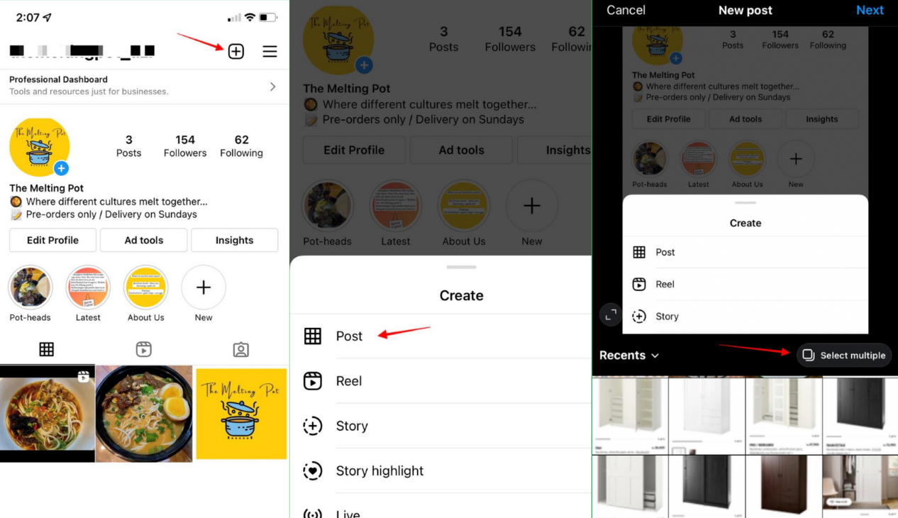 Odată ce ai aliniat imaginile sau videoclipurile perfecte, poți începe să creezi o postare de carusel pe Instagram utilizând pașii de mai jos: