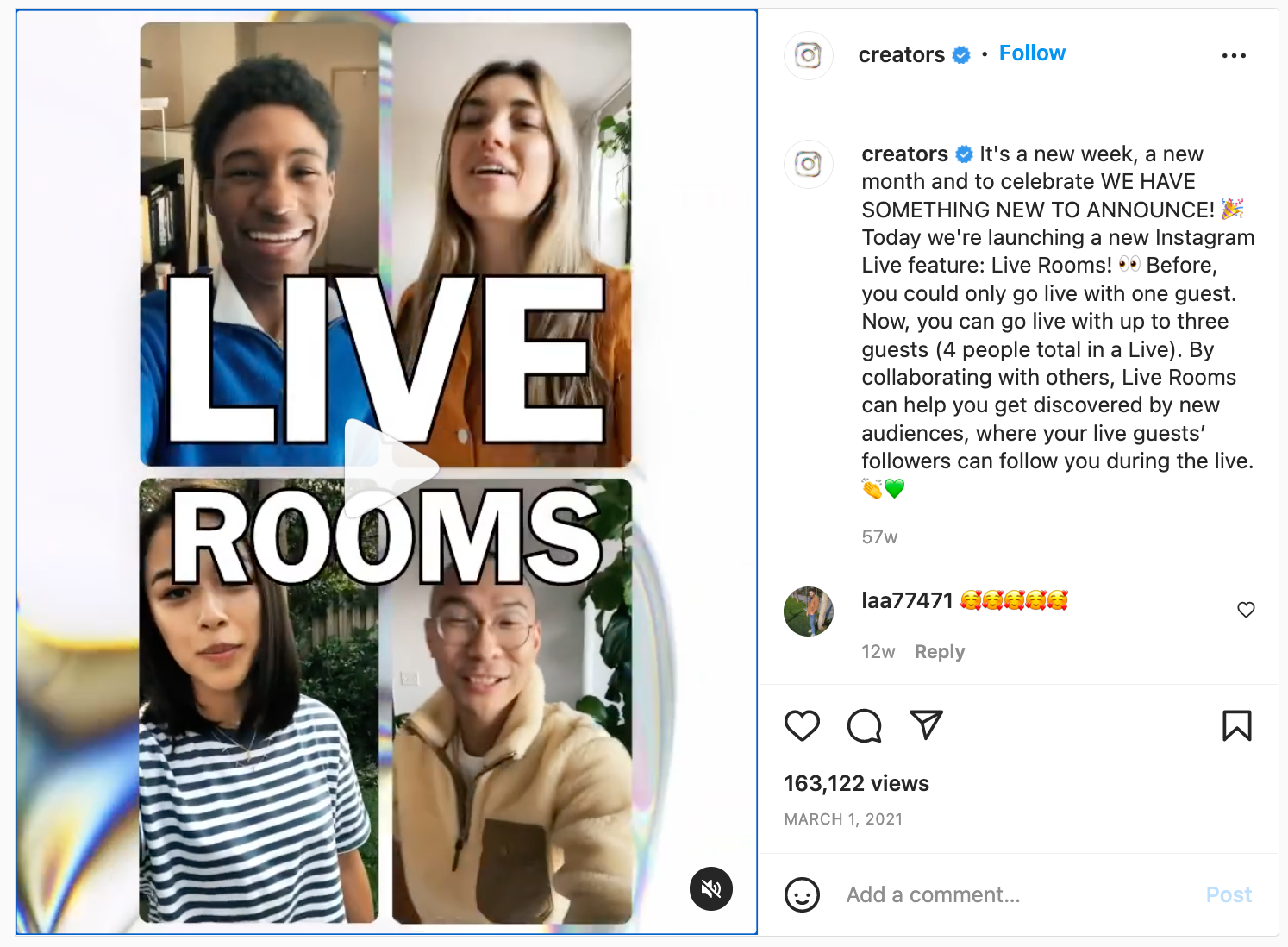 Instagram a permis recent creatorilor să găzduiască sesiuni Live cu până la trei invitați suplimentari simultan (patru persoane în total).