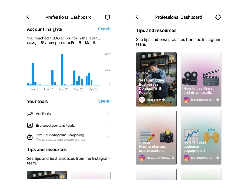 Tabloul de bord este ușor accesibil din partea de sus a paginii de profil. Mărcile pot acum să urmărească și analizele din ultimele 90 de zile folosind funcția de calendar, precum și să vadă statistici pentru postări, povești, filmări și videoclipuri live.