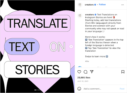 Instagram permite acum utilizatorilor să traducă textul din povești, cum ar fi subtitrările, în 90 de limbi diferite. În prezent, platforma nu acceptă traduceri audio.