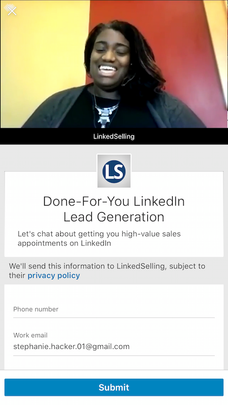 Și apoi include un formular de generare de clienți potențiali pentru a colecta clienți potențiali interesați de colectarea propriilor clienți potențiali pe LinkedIn: