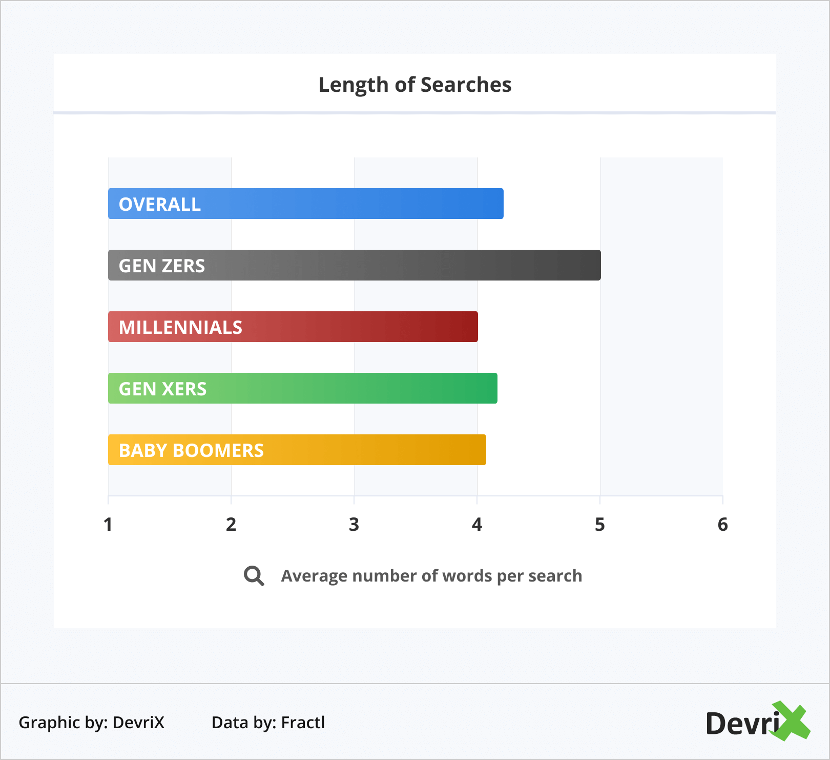 Diferența în obiceiurile de căutare ale generațiilor poate fi găsită și în dicția și alegerea cuvintelor . Diferitele generații tind să fie înclinate să includă mai des anumite cuvinte. Fractl a descoperit că generațiile mai tinere caută adesea ceea ce este „mai bun”.