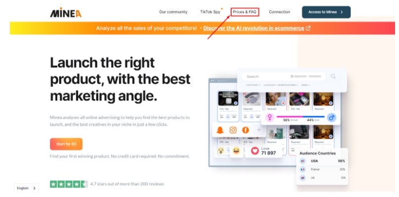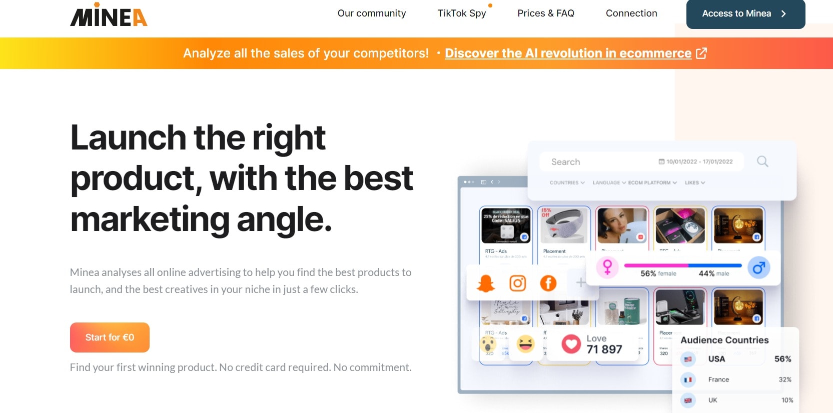 Minea poate schimba jocul în partea cea mai dificilă a cercetării produselor. Deoarece majoritatea dropshipperilor folosesc rețelele sociale pentru nevoile lor de marketing, Minea poate ajuta la identificarea unora dintre cele mai bune reclame publicitare și produse de pe piață care creează o nouă tendință sau câștigă popularitate pe rețelele sociale.