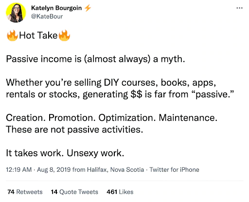 Nici munca nu se termină atunci când ați creat activul. Apoi urmează munca ulterioară de a construi un public, de a crea reclame pe rețelele sociale, de a cerceta idei de conținut și de a vă promova produsul. Activul nu se va vinde de la sine, iar oamenii subestimează adesea cât de mult efort poate fi necesar pentru a obține ochi asupra produsului dvs. și apoi a transforma acești globi oculari în clienți.