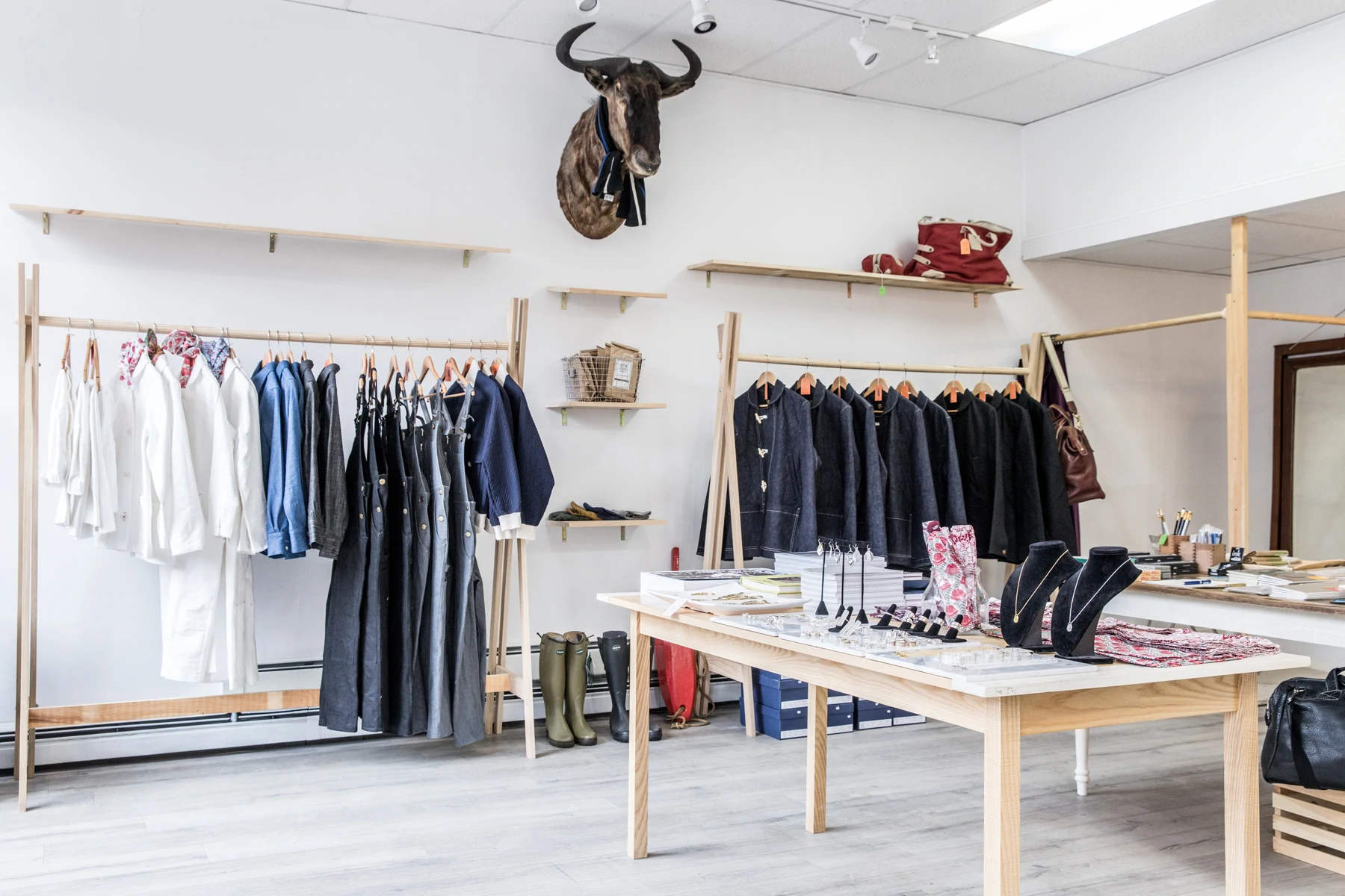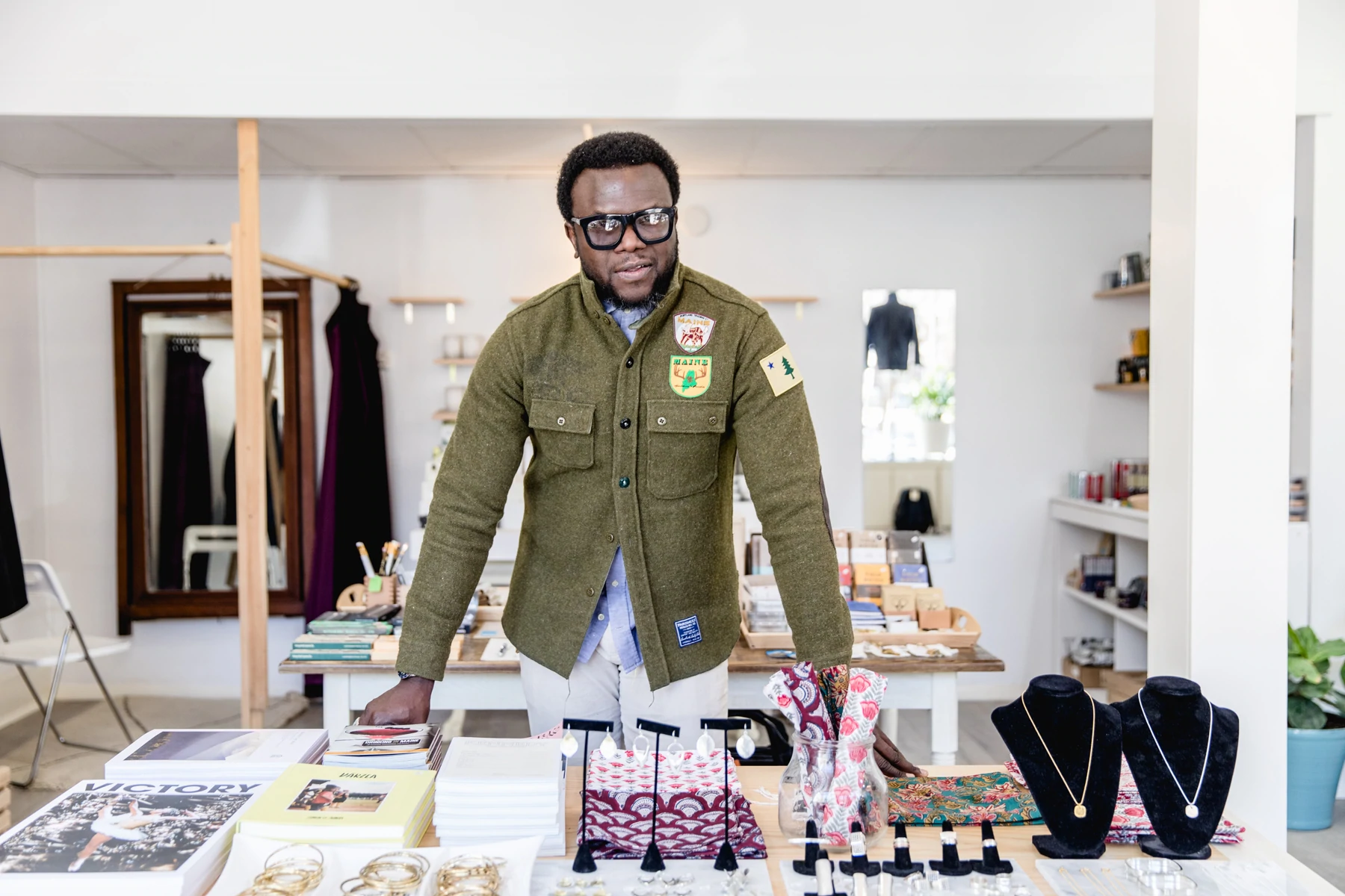 Deși Portland Trading Co. , cu o curatare superbă și o coloană sonoră extraordinară, este o experiență pentru toate simțurile tale, proprietarul său, Kazeem Lawal, este primul lucru pe care îl observi. Simțul său ascuțit al stilului – influențat de toate locurile în care a trăit înainte, inclusiv New York City și Nigeria – este în mod distinct al lui. Mă îndeamnă imediat să încerc o salopetă, una din linia proprie a Portland Trading Co. E făcută chiar aici, în Maine, îmi spune el, la fel ca aproape orice altă îmbrăcăminte din magazin.