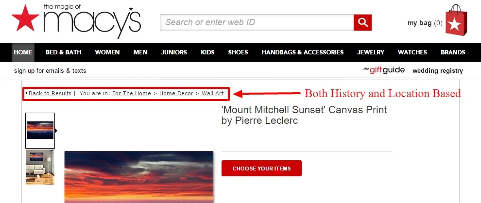 - Optimizați-vă meniul : aveți un meniu de navigare logic și ușor de făcut clic, ușor de înțeles și de navigat. Utilizați breadcrumbs pentru a ajuta utilizatorii să găsească informații fără efort. Iată un exemplu de meniu de la Macy's: