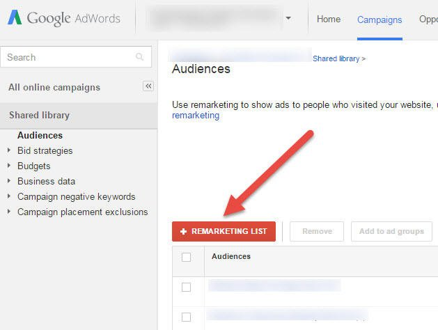 Pentru a adăuga lista de remarketing, accesați Arhiva comună > Segmente de public , apoi faceți clic pe butonul roșu +Lista de remarketing :