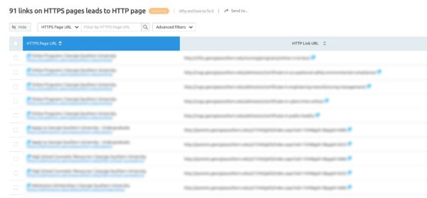 Companiile efectuează modificări ale site-ului web și nu verifică întotdeauna daunele. Uneori ajung să aibă pagini https (securizate) care indică către http (pagini nesecurizate). Semrush are un instrument de audit al site-ului web care identifică rapid zeci de probleme de genul acesta.
