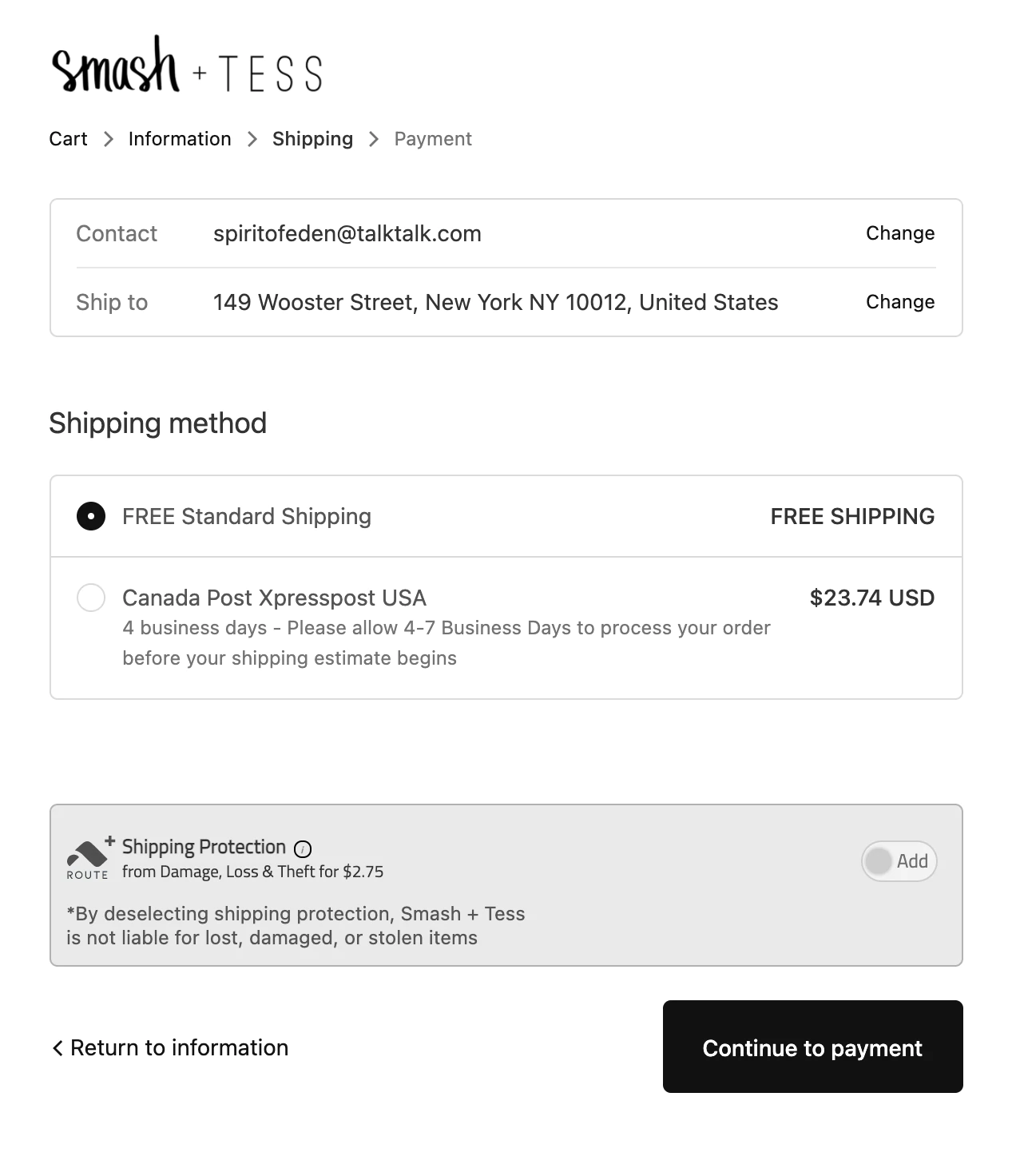 Puteți vedea cum distribuitorul de articole de îmbrăcăminte de lounge Smash+Tess comunică toate cele trei elemente la finalizarea comenzii. Clienții lor pot decide cât de repede doresc să-și obțină produsul și cât de mult îi va costa să le aducă mai repede. Chiar înainte ca banii să iasă din contul clientului, aceștia au încredere că comerciantul de la care cumpără va livra.