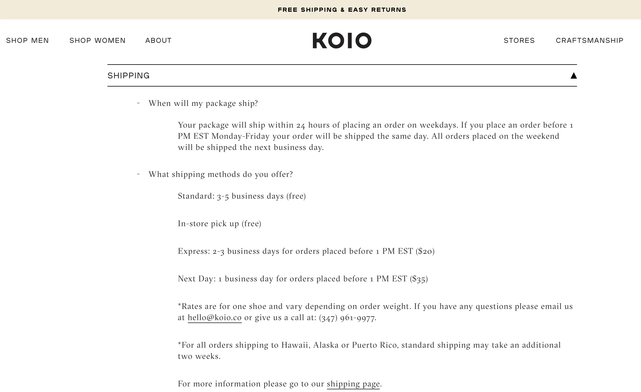 Marca de tenis Koio, își comunică vitezele de expediere pentru fiecare metodă de livrare și costurile respective, pe pagina lor de expediere. Acestea includ, de asemenea, timpul de procesare pe aceeași pagină.