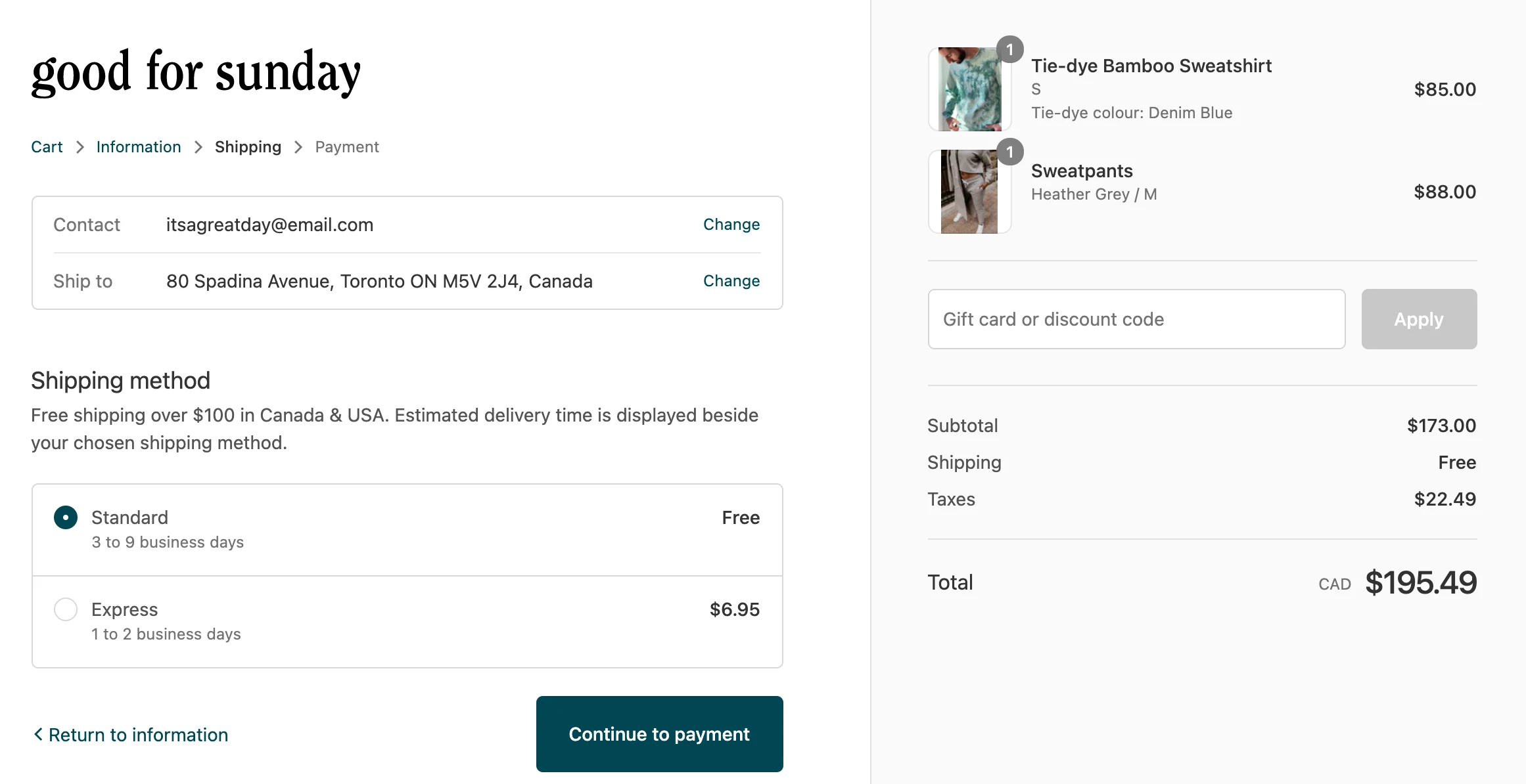 Retailerul de îmbrăcăminte etică Good for Sunday își afișează vitezele de expediere la finalizarea comenzii. Puteți vedea cum i se prezintă clientului opțiunile de expediere, costurile aferente și cât timp se anticipează că va dura transportul - totul de la casă și totul fără ca comerciantul să fie nevoit să facă calcule manuale. Clientul poate face o alegere în cunoștință de cauză și poate planifica când își va putea obține noua lor ținută confortabilă WFH!