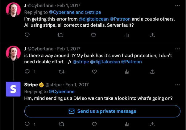 Stripe răspunde în mod proactiv clienților care postează despre problemele cu care se confruntă pe rețelele sociale.