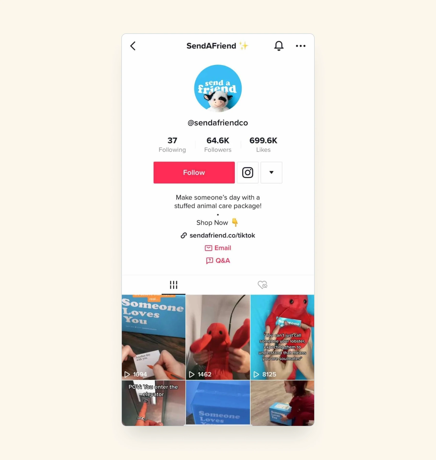 TikTok este adesea folosit pentru creșterea gradului de conștientizare a mărcii, dar poate fi și un motor de vânzări datorită funcției sale „link in bio”, care vă permite să prezentați o gamă de conținut și produse dintr-un singur link. Comerciantul Shopify SendAFriend a reușit să crească la 5 milioane de dolari în vânzări în doi ani, datorită strategiei sale de marketing TikTok.