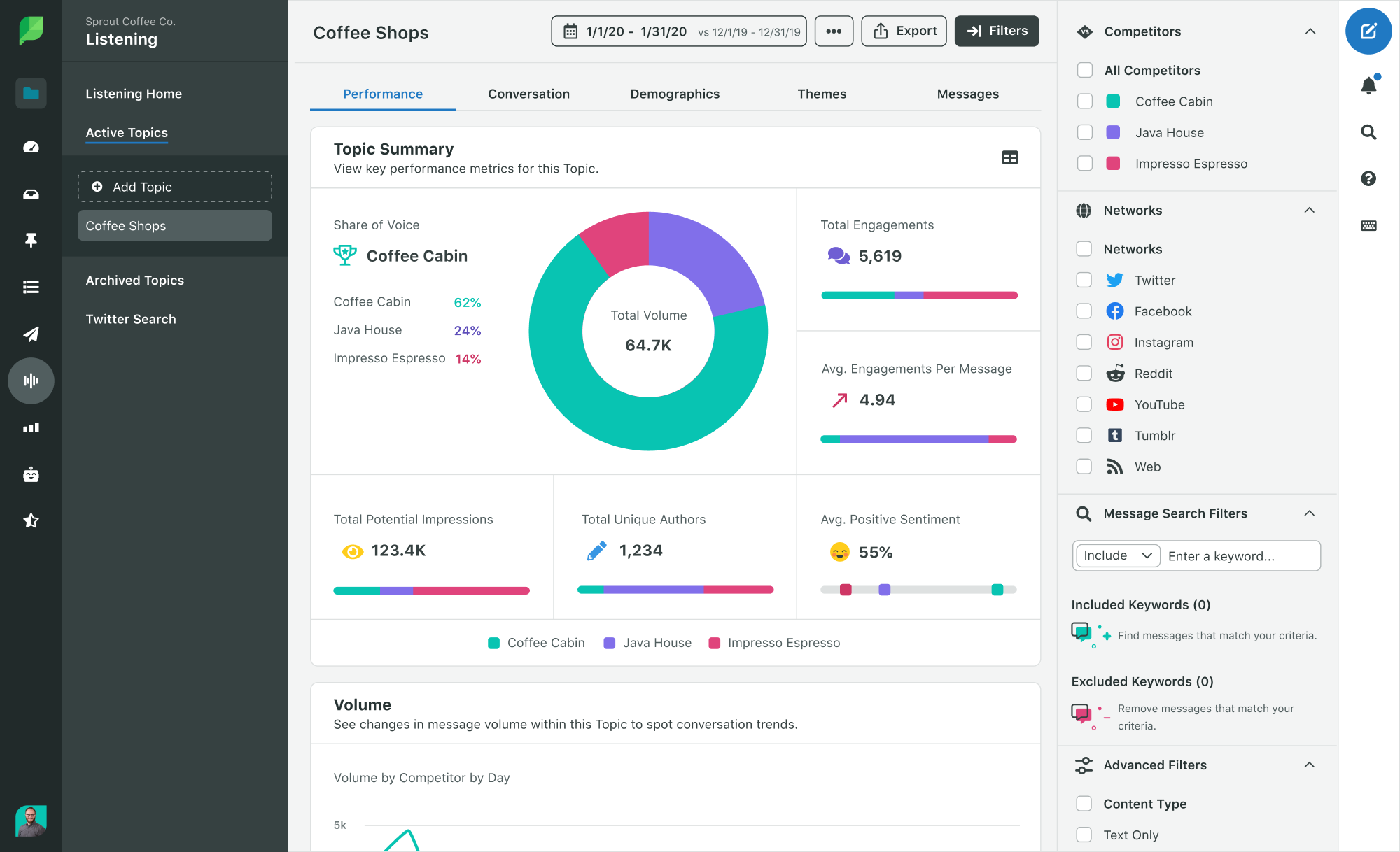 Indiferent de dimensiunea afacerii sau industria dvs., analiza competitivă este unul dintre cele mai importante instrumente pe care ar trebui să le utilizați pentru a vă diferenția marca și a vă crește cota de voce. Platforma Sprout facilitează compararea performanței, analiza conținutului concurenței și obținerea de informații mai profunde despre industria, produsele și clienții dvs. Aceste informații nu numai că vor ajuta la îmbunătățirea strategiei dvs. de marketing, dar vor oferi, de asemenea, o valoare comercială semnificativă în întreaga organizație.