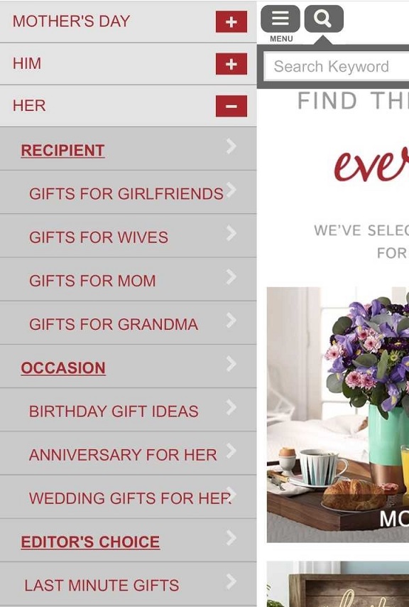 Gifts.com este un site de comerț electronic mobil care folosește în mod inteligent diverse metode de căutare și categorii de produse. Aspectul este curat și cu spații negative albe întrerupte de imagini colorate ale produselor. Schema de culori se bazează pe roșu închis, care este o culoare grozavă legată de emoții puternice, cum ar fi dragostea, care este exact ceea ce doriți într-un site web de cumpărături de cadouri.