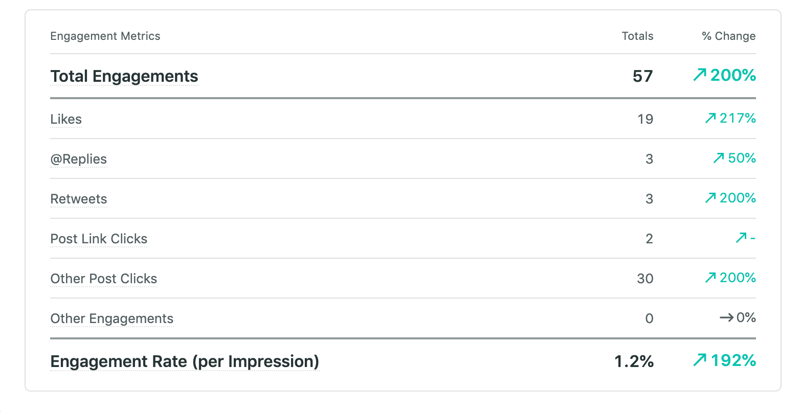 Ce măsoară: interacțiunile măsoară numărul de interacțiuni realizate cu un Tweet. Acesta este dat atât la nivelul unui singur Tweet, cât și la nivelul total de activitate al tuturor Tweet-urilor. Interacțiunea include toate modalitățile prin care cineva ar putea interacționa cu Tweetul dvs., inclusiv: extinderi media, aprecieri, @răspunsuri, retweeturi, urmăriri dintr-un Tweet, clicuri pe linkuri și multe altele. Twitter oferă o listă a diferitelor angajamente pe care le urmăresc și definițiile lor.