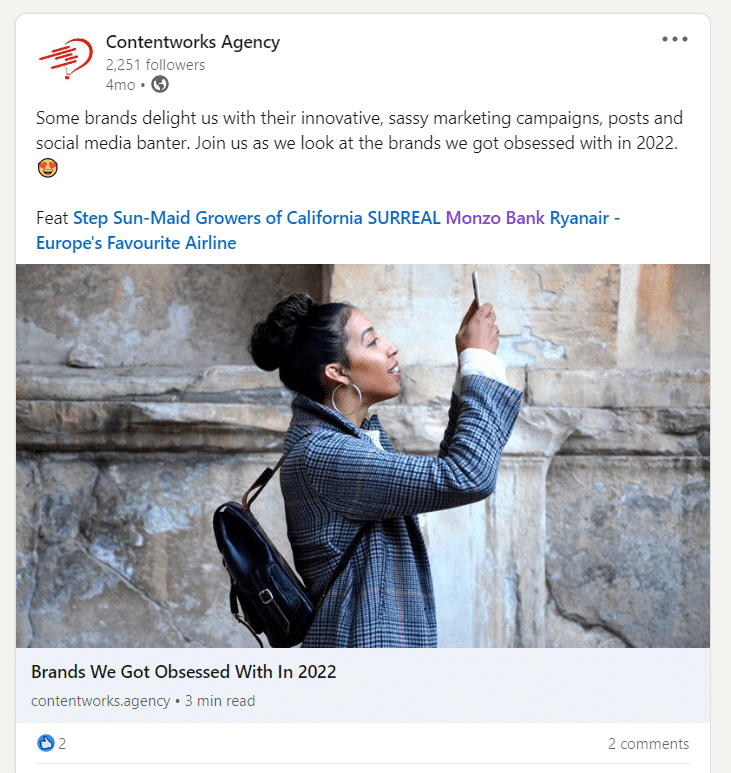 - Tot conținutul tău trebuie să producă rentabilitatea investiției? eu as argumenta ca nu. La Agenția Contentworks, păstrăm canalul nostru TikTok pentru prostii non-promoționale, cum ar fi cel mai recent videoclip aici. Este pe brand, reflectă personalitățile agenției noastre și generează un angajament deosebit. Am primit indicii de la asta? Nu direct. Dar ne place să arătăm ce putem face. Și să te distrezi puțin în același timp.