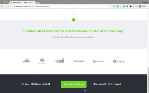 În cel de-al treilea exemplu de buton CTA, BambooHR își evidențiază butonul CTA cu o culoare contrastantă, copia specifică faptul că demonstrația este gratuită și există chiar indicii direcționale săgeată îndreptate spre aceasta pe ambele fețe: