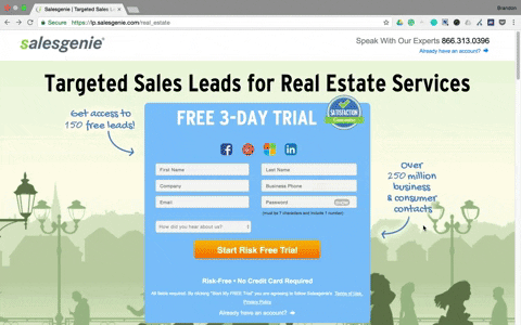 Observați din nou butonul CTA. Culoarea sa portocalie strălucitoare atrage atenția și folosește o copie convingătoare („gratuită”), ceea ce duce probabil la mai multe clicuri. Când vizitatorii dau clic pe acesta (sau pe oricare dintre butoanele CTA cooperative), aceștia sunt trimiși înapoi în partea de sus a paginii pentru a începe o perioadă de încercare gratuită Salesgenie.
