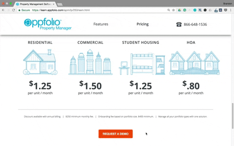 AppFolio folosește, de asemenea, un buton CTA pentru a redirecționa potențialii către formularul lor de captare a clienților potențiali. După ce vizitatorii au parcurs întreaga pagină, văd acest buton portocaliu CTA. Butonul este un link ancoră care redirecționează către formularul din partea de sus a paginii: