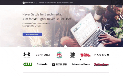 Pentru a se asigura că poveștile de succes ale clienților lor nu sunt trecute cu vederea, Dynamic Yield oferă o săgeată de etichetă ancoră care sări, pentru a atrage atenția și a îndruma vizitatorii în direcția corectă. Când potențialii dau clic pe săgeată, aceștia ocolesc logo-urile mărcii și sunt direcționați direct la videoclipurile cu poveste de succes: