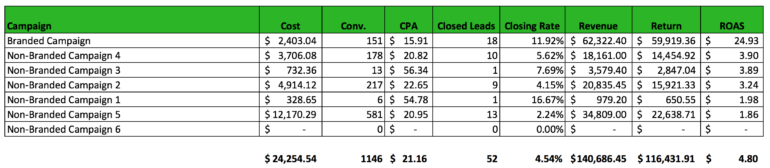 В 2016 году мы использовали ROAS, чтобы сократить неконвертирующие расходы и повысить общую прибыльность. В конце второго квартала цена за конверсию была почти на 18% выше нашей цели в 20 долларов. Чтобы решить эту проблему, мы изучили наши кампании с самой высокой ценой за конверсию и отметили, что одна кампания («Кампания 1») почти в два раза превышала нашу целевую цену за конверсию за последний год, но также принесла наибольший доход по сравнению с ее расходами. С другой стороны, мы могли видеть, что наша кампания с самым низким уровнем конверсии («Кампания 6») не закрыла ни одного потенциального клиента за последние 12 месяцев.