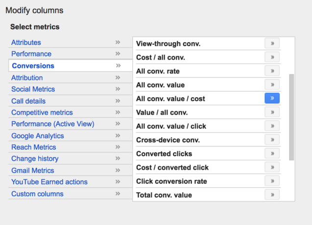 Если вам посчастливилось иметь доступ к данным о доходах потенциальных клиентов в AdWords, либо путем связывания с Salesforce, либо с помощью других средств импорта конверсий, вам будет доступно еще больше возможностей. Возможно, вы еще не узнали или еще не воспользовались столбцом «Ценность / стоимость всех конв.» В AdWords. Этот показатель, доступный на уровне кампании, группы объявлений, ключевого слова и поискового запроса, служит близкой заменой рентабельности инвестиций в рекламу и легко доступен в интерфейсе.