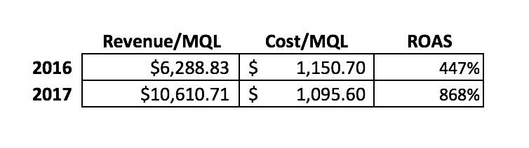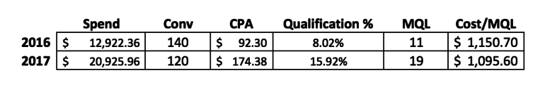 Информация о квалифицированных на рынке потенциальных клиентах (т. Е. Запросы, которые переходят в обсуждения о продажах) и доход, связанный с закрытием этих потенциальных клиентов, полностью изменили историю, которую рассказывали наши цифры. Если посмотреть на первые два месяца 2016 года по сравнению с 2017 годом, мы увидели значительный рост расходов, но при этом снизился объем конверсии и увеличилась цена за конверсию. И только после рассмотрения уровня квалификации запросов (конверсий) в MQL мы начали понимать, что происходит на самом деле.