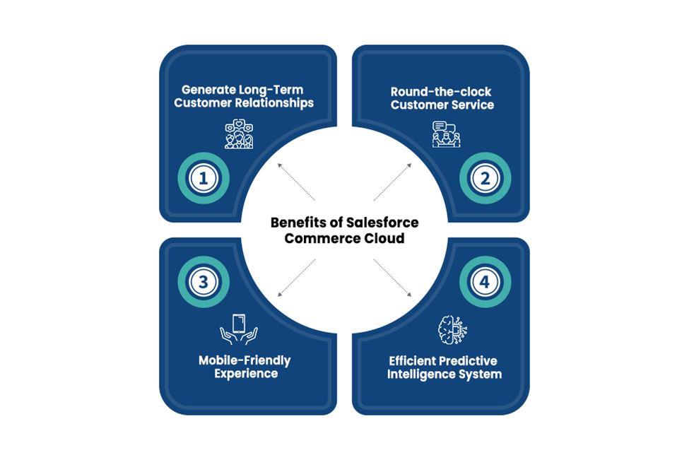 Ниже приведено одно из преимуществ облака Salesforce Commerce. Когда вы интегрируете или интегрируете свою платформу заказов с Salesforce, она предложит вам всестороннее представление клиента о каждом поведении, потребностях и предпочтениях. Следовательно, это обеспечивает персонализированное и ценное предоставление услуг, укрепление хороших отношений с клиентами и увеличение продаж, повышение коэффициента конверсии, взращивание потенциальных клиентов и т. д.